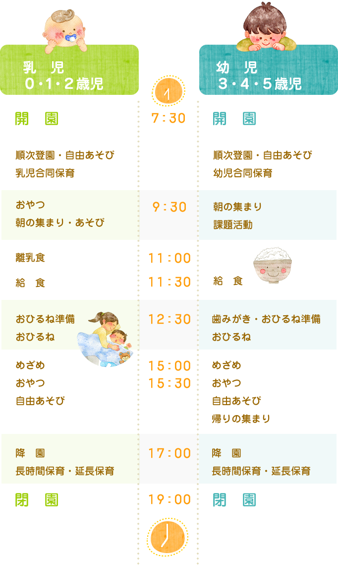 長時間保育と延長保育は、保護者の勤務時間などにより、通常保育時間にお子さまの送り迎えができない方のために実施しています。 ご利用にあたっては園にご相談ください。